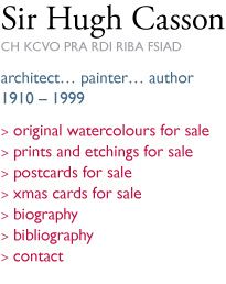 However it is for his wonderfully intimate and observant watercolours that he is best known. A superb draughtsman despite little formal training, his ability to capture in watercolour the character of a place has been celebrated by the illustrations in the books he wrote so easily; Hugh Casson's Cambridge, Hugh Casson's Oxford, Hugh Casson's London, amongst others. His paintings have a singularity stemming from a passion for the minutiae of his surroundings. Drawing on his ability to closely observe he attracts the attention of the viewer to the tiny details that make up an overall impression of a place. Each work is fundamentally personal and filled with his affectionate perception; his work has a dedicated following and remains increasingly sought after. |